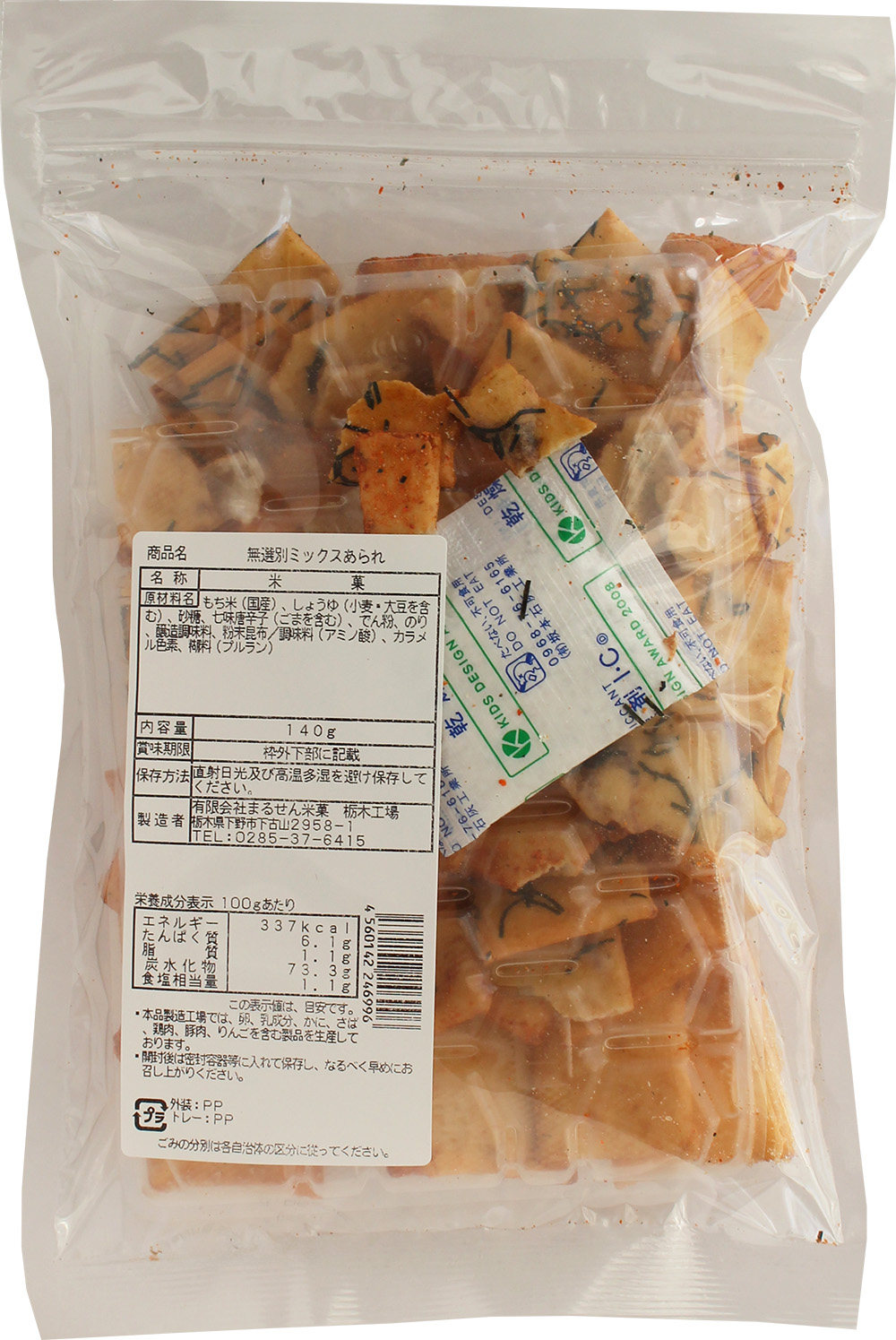 | 原材料名 | もち米(国産)、しょうゆ(小麦・大豆を含む)、砂糖、七味唐辛子(ごまを含む)、でん粉、のり、醸造調味料、粉末昆布/調味料(アミノ酸)、カラメル色素、糊料(プルラン) |