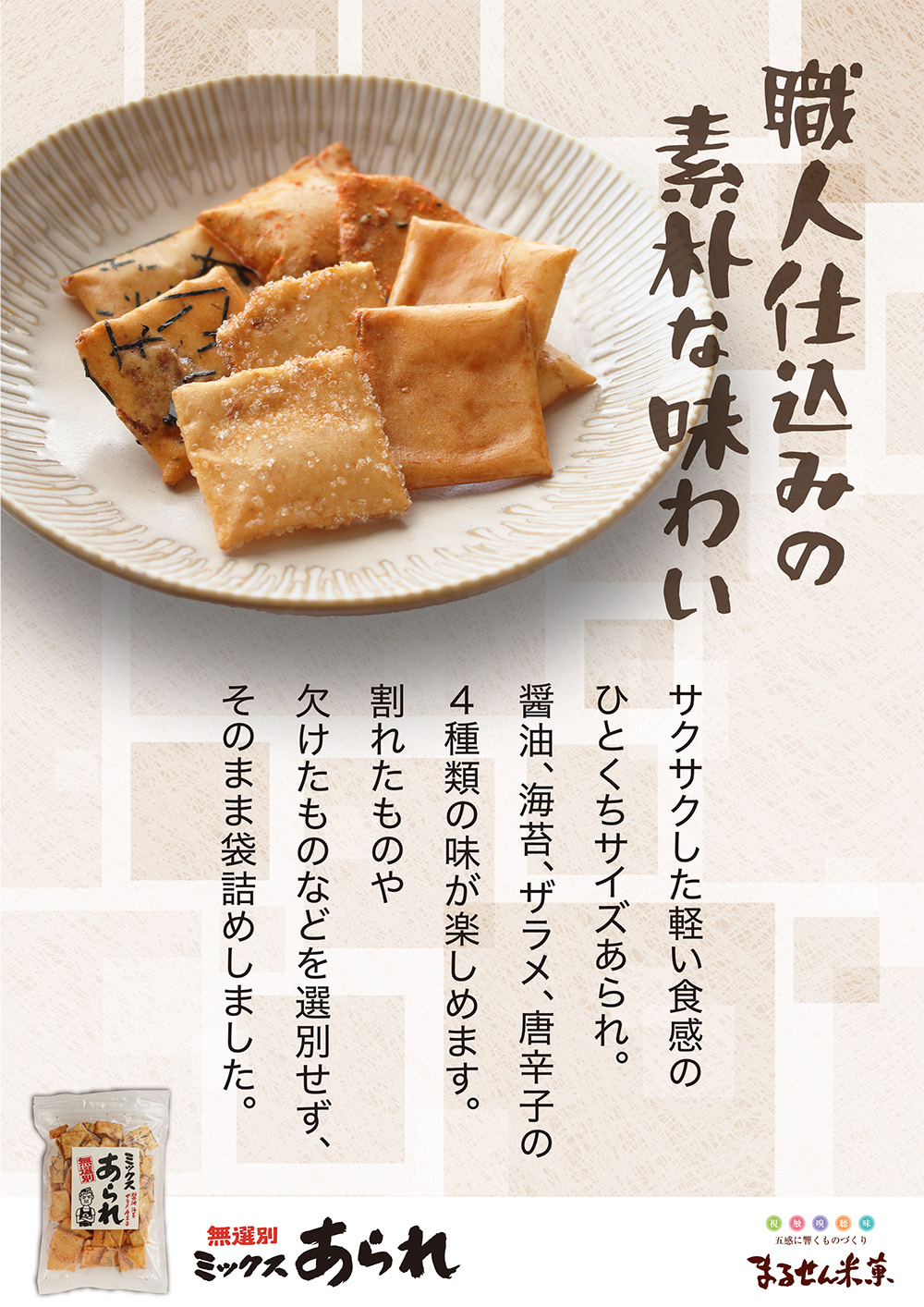 サクサクした軽い食感のひとくちサイズあられ。一袋で醤油・海苔・ザラメ・唐辛子の4種類の味が楽しめます。