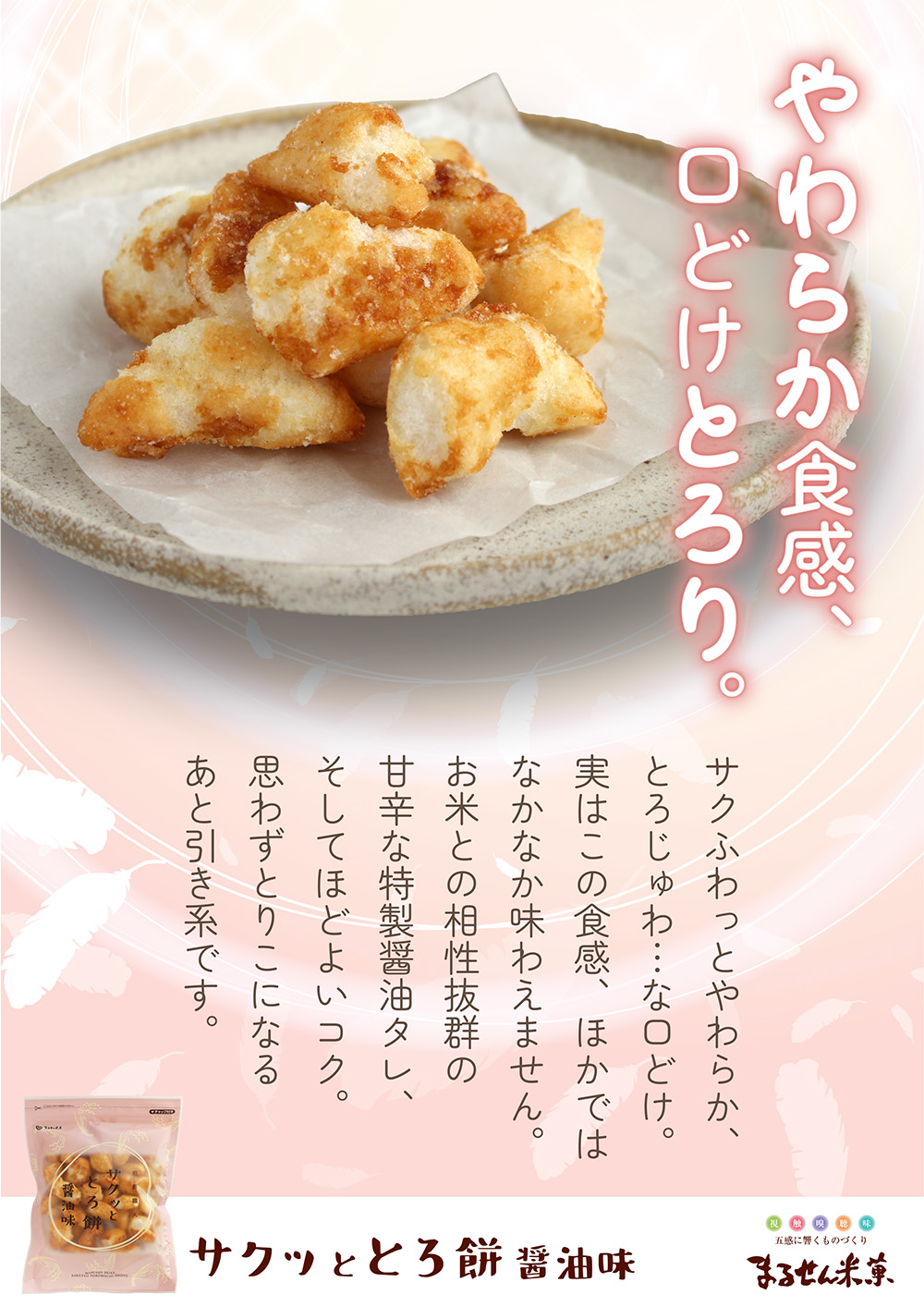 大変柔らかい食感で食べやすく後を引く、一口サイズの甘口醤油ダレをからめた揚げ餅です。